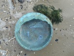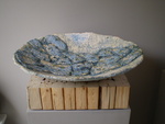 2009De blauwe schaal is in een mal gemaakt en afgwerkt met de hand. Hij is behandeld met engobes en glazuren. Gestookt op 1040 gr. Celc.