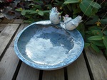 2016Vogeldrinkbak, glazuur en engobes....op de rand 2 kipjes, bewerkt met oxyden en glazuur. Handgevormd.