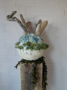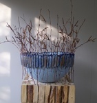 2010Kom, bewerkt met glazuren, daarna rookgestookt, staat op een voet van handgevormde rollen klei...De kom is gevuld met bloemen van keramiek, rotanstokken en omwikkeld met wilgetakken.