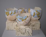 20124 kommen op kruisvormige sokkel...handvormen...bewerkt met engobes en glazuur en oxyden.